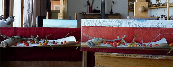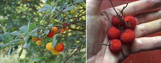 Madrogno heet deze plant in Portugal, in het Nederlands heet het aardbeiboom (niets met aardbeien te maken). De vruchtjes zijn een beetje stekelig en rood als ze rijp zijn en diep geel als ze nog niet rijp zijn. Het landschapje boven het stilleven is de vallei waar ik deze struikachtige boom, Madrogno, heb gevonden in Portugal.