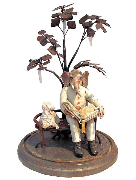 De beelden van Peter Hiemstra zijn geen eenduidige vormen, maar bestaan uit beeldverhalen: levendige taferelen en gebeurtenissen, soms met diverse protagonisten, die op de meest bizarre manieren met elkaar zijn verweven: een ‘ordinary Dutch bear’, met een keramieken zuil die uit zijn hoofd groeit, een ‘giraffenman in zijn natuurlijke habitat’, of ‘heroes and villains’, een wandsculptuur, met daarop een collage van striptekeningen en oude foto’s, een keramische sculptuur en in het midden een beest, dat een kruising lijkt tussen een hert en de wolf van Roodkapje. Door middel van zijn sculpturen creëert Peter Hiemstra zijn eigen wetten en waarheden. En wij, de kijkers, mogen staren, bewonderen en ons blijven verbazen.