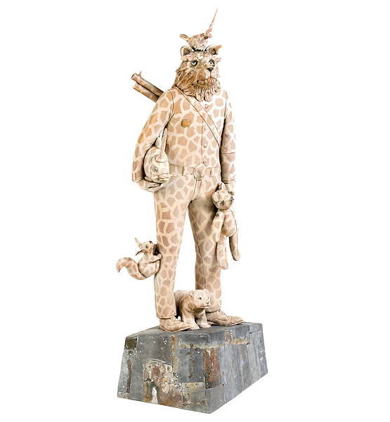 De meeste van zijn keramische creaties lijken op mensen met dierenkoppen, waardoor ze in eerste instantie vooral amusement oproepen. Door hun houding, de attributen die ze bij zich dragen of hun uitmonstering, vervaagt de grens tussen mens en dier. Onder de grappige eerste indruk schuilt echter een grimmigere laag. Je vraagt je af of de dieren een imitatie van de mens moeten voorstellen, of het juist om een karikatuur van de mens gaat, die zich helaas maar al te vaak als een beest gedraagt. Peter Hiemstra laat ons nadenken over de manier waarop wij naar de wereld kijken, onze eigen ideeën, waarden en overtuigingen, terwijl hij tegelijkertijd ongegeneerd de draak met ons steekt.
