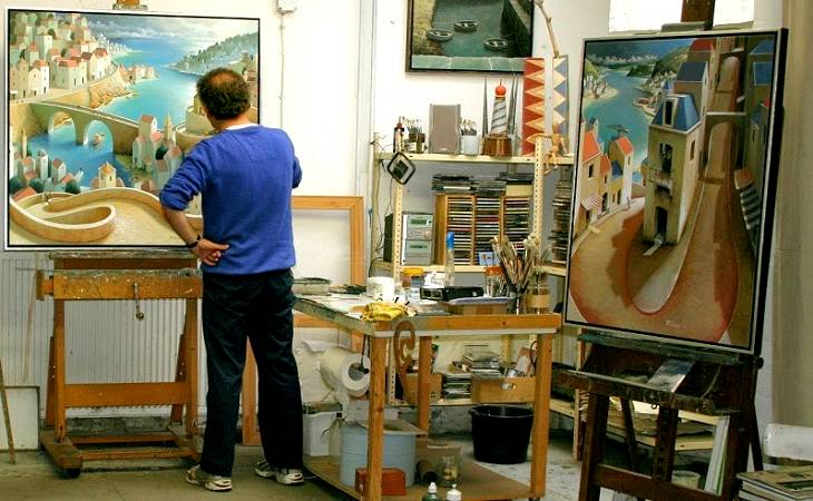 Michiel Schrijver (1957) werd geboren in het Gooise Blaricum, maar zijn schilders aspiraties zouden hem later tot ver over de Nederlandse grenzen voeren. Hij begon zijn kunstopleiding in 1976 aan de Dartington School of Art in Devon, gevolgd door de Byam Shaw School of Arts en uiteindelijk de Camberwell School of Art in London, waar hij in 1981 afstudeerde. Daarna verdiepte hij zijn schildersvaardigheden aan het Nederlandse Centrum voor Ambachten te Amsterdam, waarna hij in 1985 zijn eerste eigen galerie en atelier opende. Vanaf 1993 is Michiel Schrijver uitsluitend aan het werk als autonoom schilder. Voordat hij aan een schilderij begint, tekent hij hele schetsboeken vol met zijn ideeën. Alleen de schetsen die het kritische oog van de meester kunnen doorstaan, worden met acrylverf vastgelegd op het doek. Bepaalde elementen komen daarbij steeds weer terug: ingenieuze bouwwerken met pilaren, koepels, bruggen en bogen, daarbij vaak voorzien van linten, wapperende vlaggen of wegwijzers met nummers en cijfers. Of er al dan niet een diepere betekenis aan al deze elementen vastkleeft, blijft open voor interpretatie.