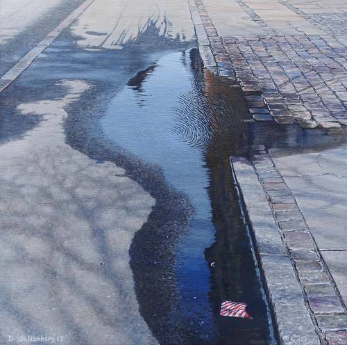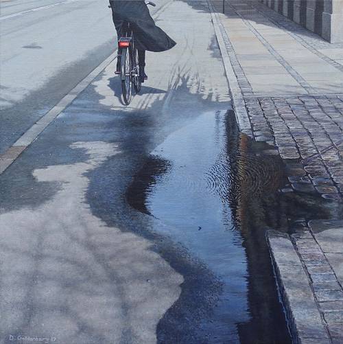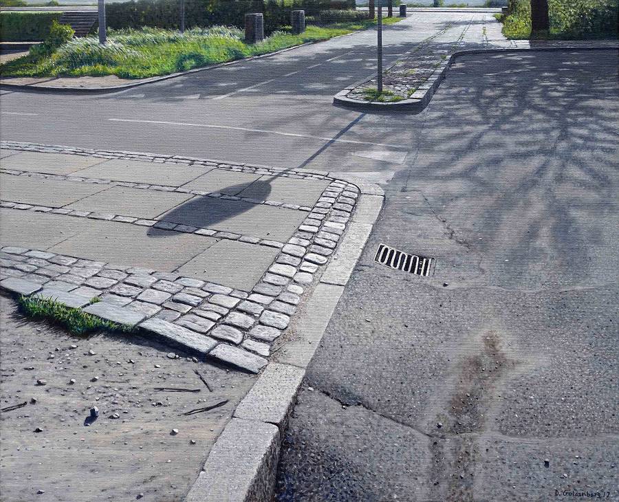 De Deense kunstenaar Daniel Goldenberg is een schilder van über-realistische stadsbeelden. Alledaagse details in een stad, zoals een regenplas waar net iemand doorheen is gefietst, een straathoek of een detail aan een gebouw, worden op haast griezelig realistische wijze weergegeven. Je vraagt je af hoe het de schilder is gelukt om een effect te bereiken, dat kan wedijveren met het resultaat van een fotolens. Tijd om nader kennis te maken met dit fenomeen van de realistische schilderkunst.