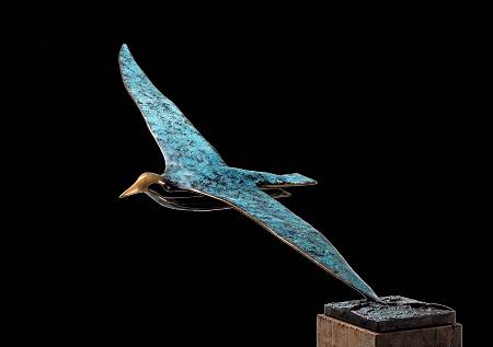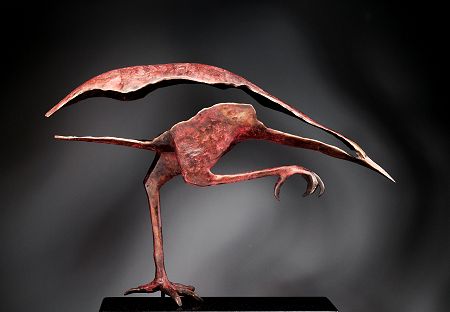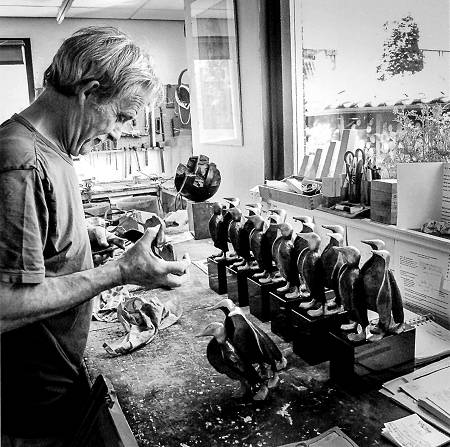 Ik merk vaak dat de totstandkoming van een bronzen beeld nog altijd een mysterie, en een zwaar onderschat proces, is voor veel mensen. Beste jammer, want er gaan veel bloed, zweet en tranen aan een mooi beeld vooraf. Helaas is mij maar een beperkt aantal woorden toegestaan, maar om u toch een indruk te geven. Het begint met een idee, dan ga je schetsen, je bouwt een skelet van lasdraad en zevengaas en boetseert hierop verder met plakkerige was. Dan volgen heel wat ritjes naar de bronsgieterij waar je je eigen creatie in stukken mag zagen, besmeuren met siliconenpasta en moet kliederen met gips en gravel om was modellen in te vormen. Als je beeld dan na enkele weken is gegoten, en in grove stukken brons voor je ligt, mag je aan de slag met het lassen, slijpen en schuren. Hoe romantisch. Als klapper op de vuurpijl zet je nu de brander op je beeld en bewerk je het met allerlei dampende zuren om je vogels die mooie gekleurde veren te geven. Nu is je beeld weliswaar klaar, maar moet het nog een knappe sokkel krijgen. Dus op naar de steenhouwer, passen en meten, slepen met sokkels, boren van gaten en verlijmen van beelden. En als het totaalbeeld dan eindelijk voor je neus staat, mag je het weer wegbrengen en plaatsen bij verschillende galerieën lekker verspreid over het hele land of een uiteindelijke (altijd aardige) koper, die ook altijd aardig ver weg woont.
