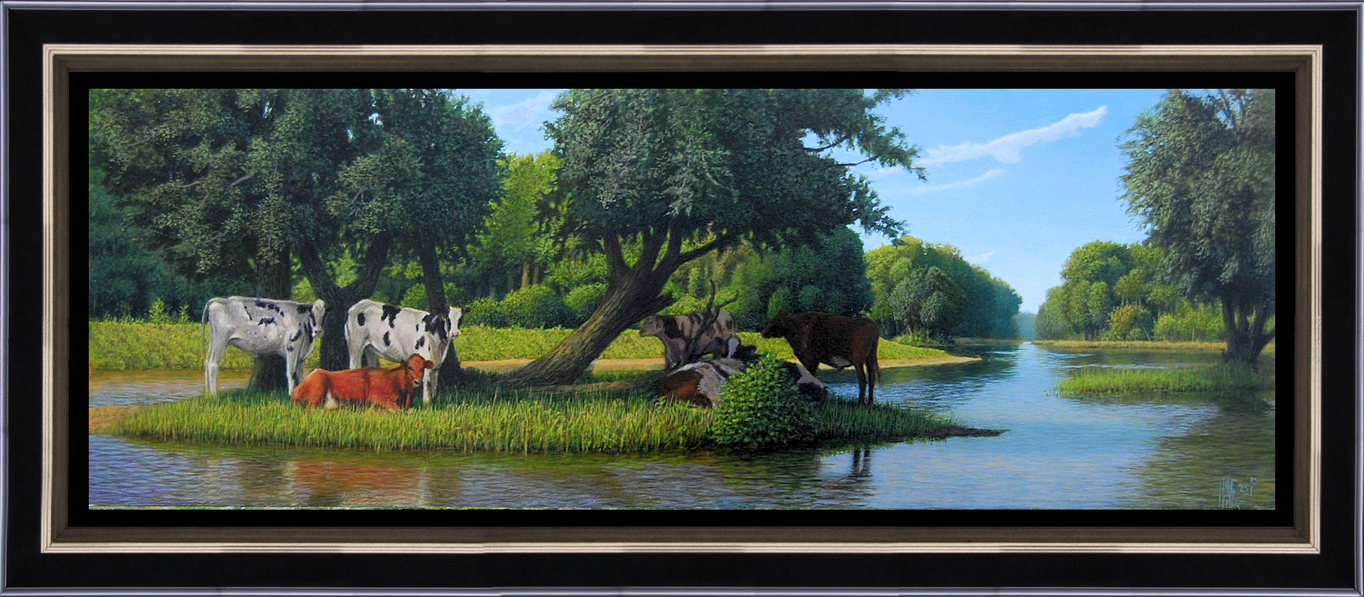 Het schilderij is 16,5 x 46 cm en voorzien van een zwart met zilveren houten baklijst. De totale afmeting is 29 x 59 cm