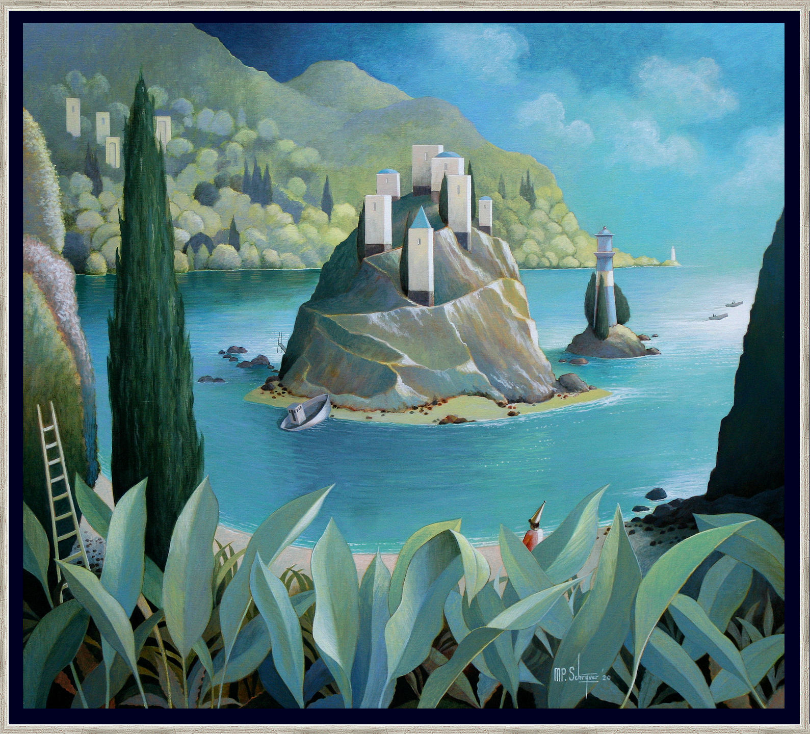 Het schilderij is 90 x 100 cm en voorzien van een houten baklijst handmatig gekleurd en opgelegd met echt zilver. De totale afmeting is 95 x 105 cm