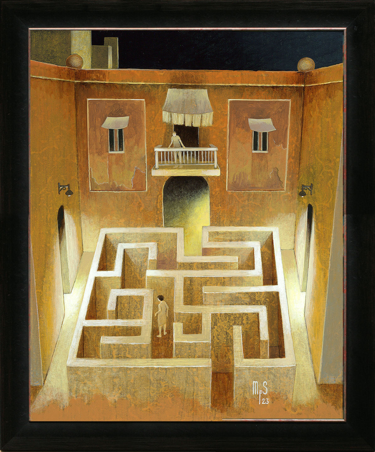 Het schilderij is 50 x 40 cm en voorzien van een zwarte lijst met zilveren binnenrand. De totale afmeting is 49 x 59 cm