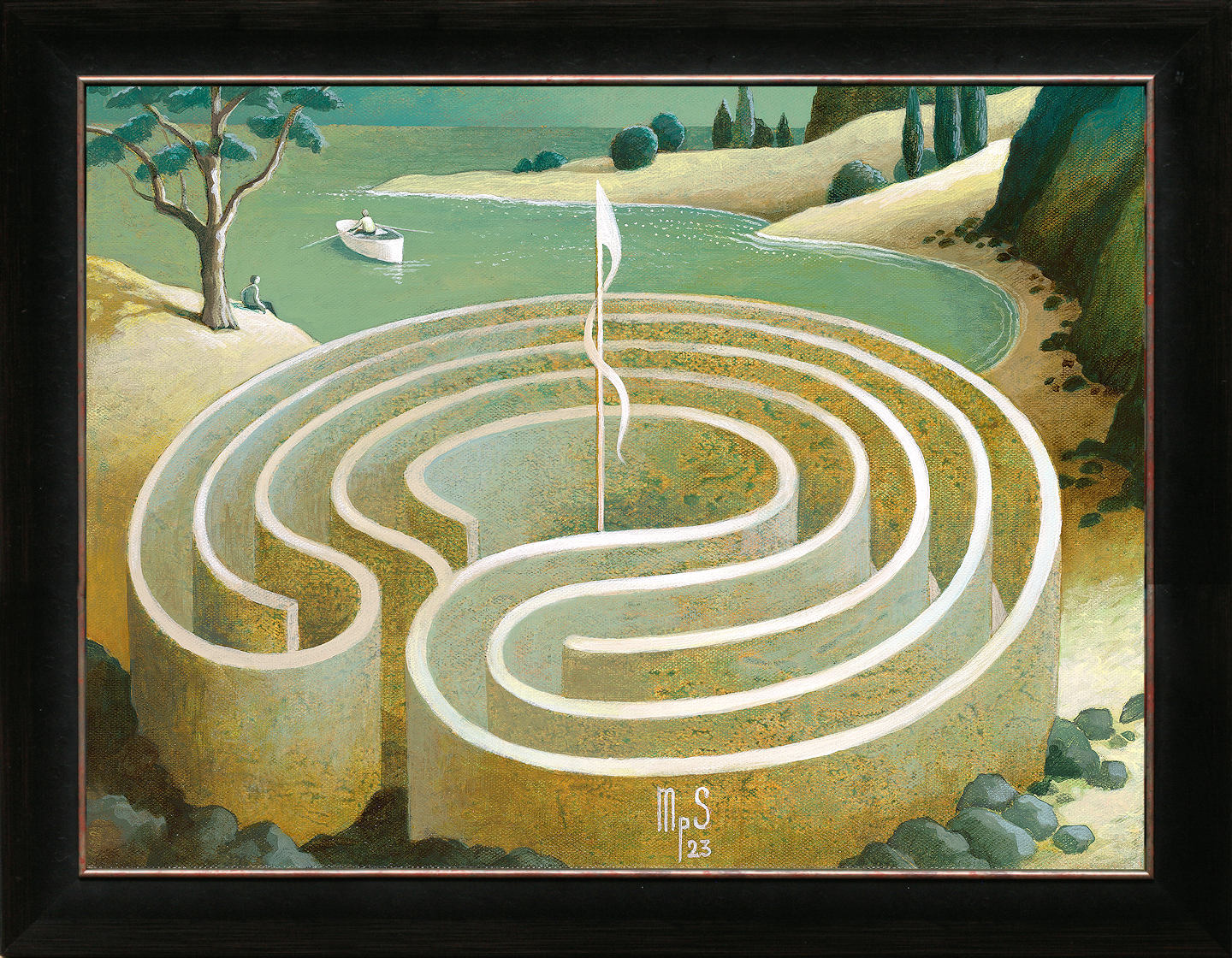 Het schilderij is 30 x 40 cm en voorzien van een zwarte lijst met zilveren binnenrand. De totale afmeting is 39 x 49 cm