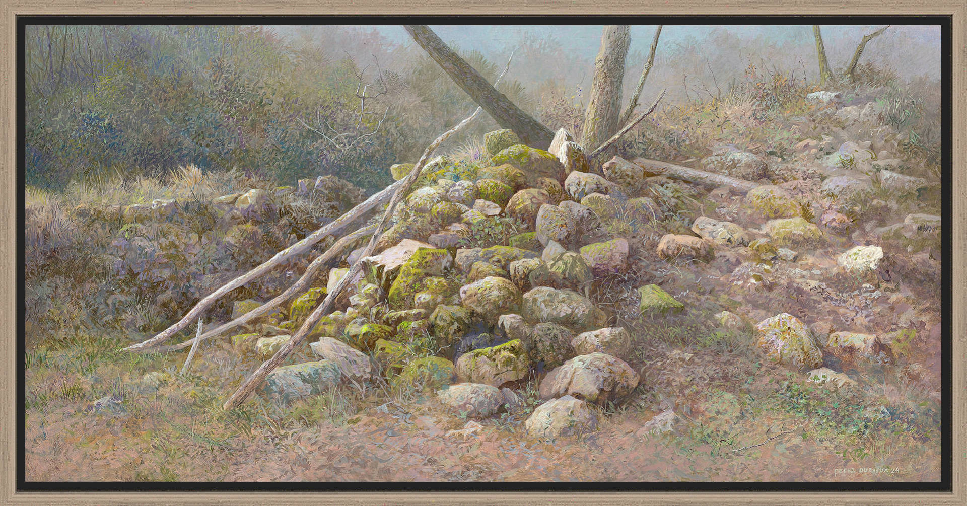 Het schilderij is 20 x 40 cm en voorzien van een blank houten baklijst. De totale afmeting is 22 x 42 cm