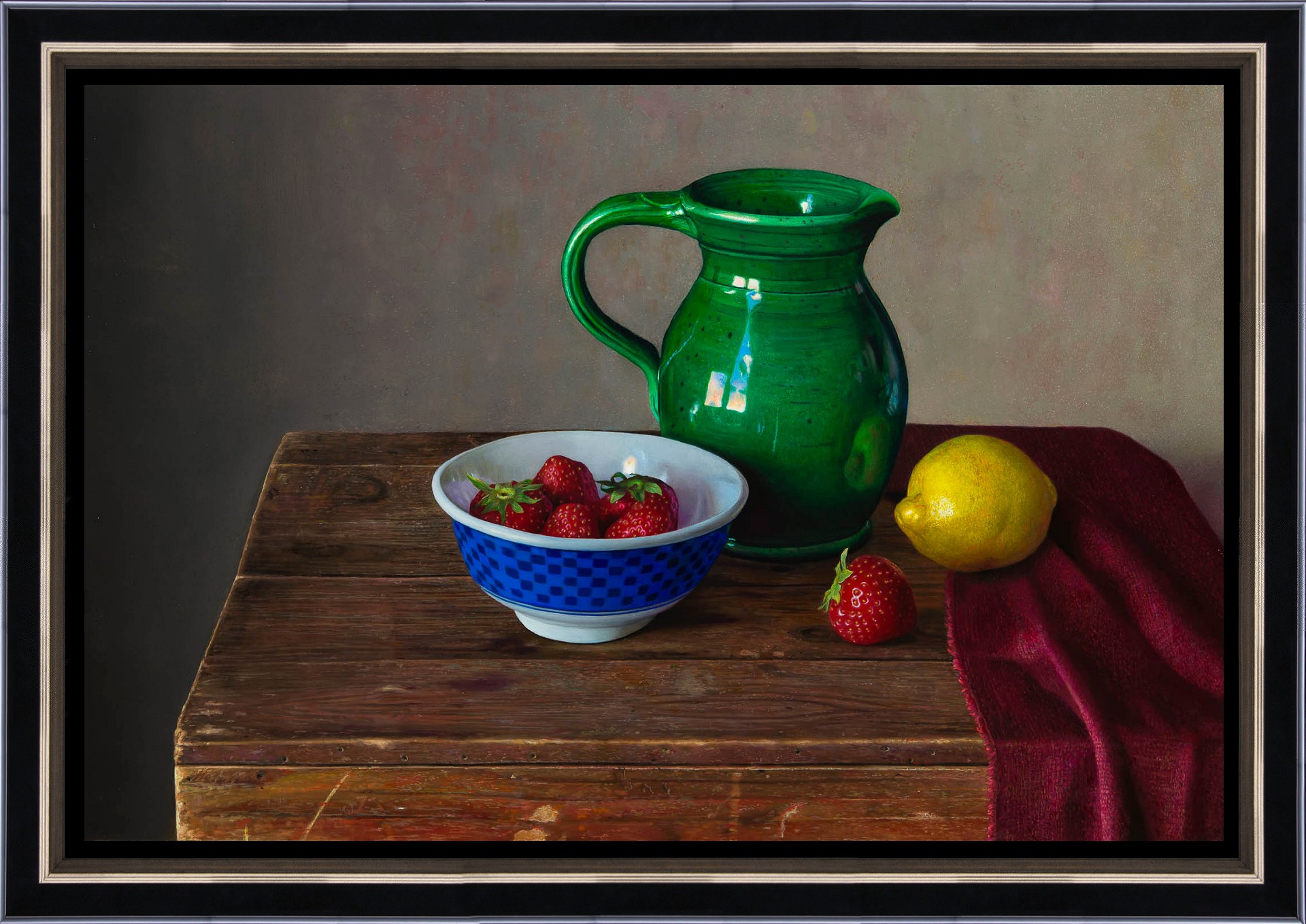 Het schilderij is 40 x 60 cm en voorzien van een zwart met zilveren houten baklijst. De totale afmeting is 53 x 73 cm