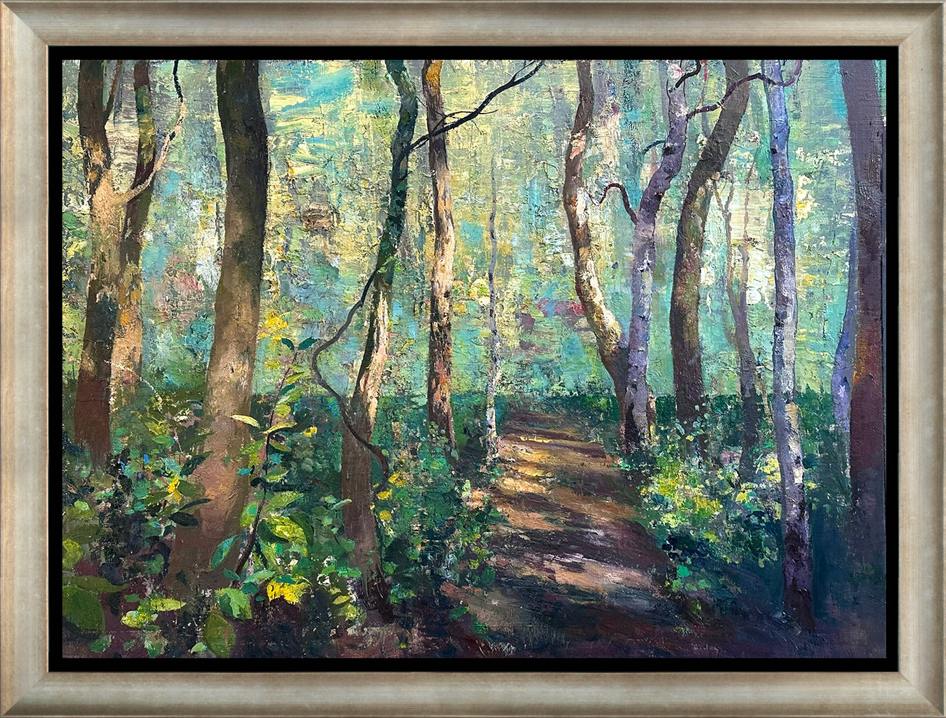 Het schilderij is 45,5 x 60 cm en voorzien van een zilveren houten baklijst. De totale afmeting is 57 x 72 cm