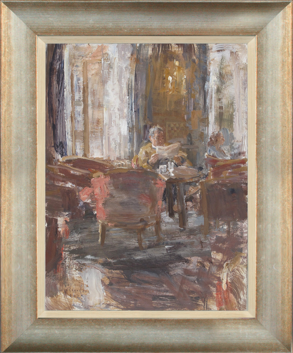Het schilderij is 40 x 30 cm en voorzien van een zilveren houten lijst met inleg. De totale afmeting is 52 x 42 cm