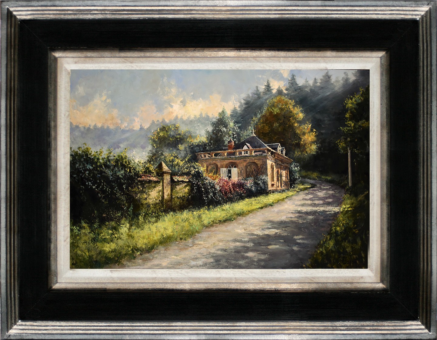 Het schilderij is 40 x 60 cm en voorzien van een handgemaakte zwart lijst met zilveren binnenrand en inleg. De totale afmeting is 57 x 77 cm