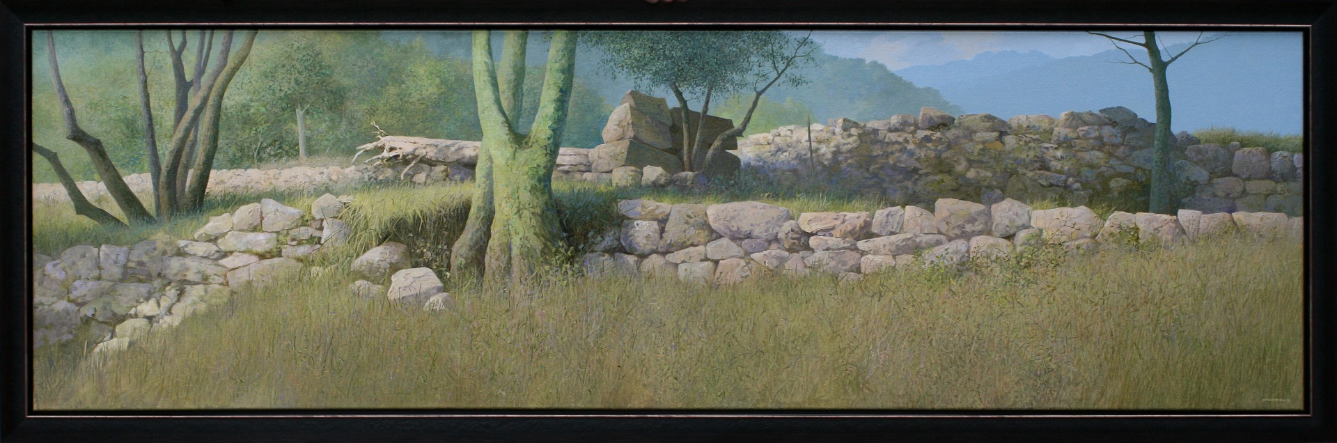 Het schilderij is 60 x 200 cm en voorzien van een zwarte houten baklijst. De totale afmeting is 65 x 205 cm