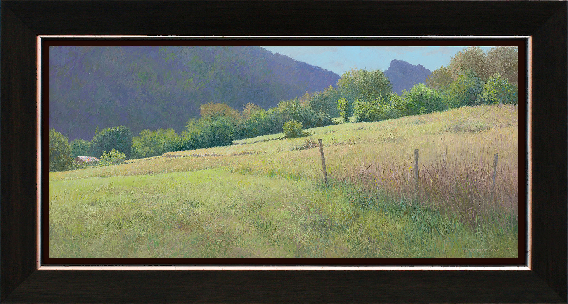 Het schilderij is 18 x 40 cm en voorzien van een zwarte houten baklijst met zilveren binnenrand. De totale afmeting is 28 x 50 cm