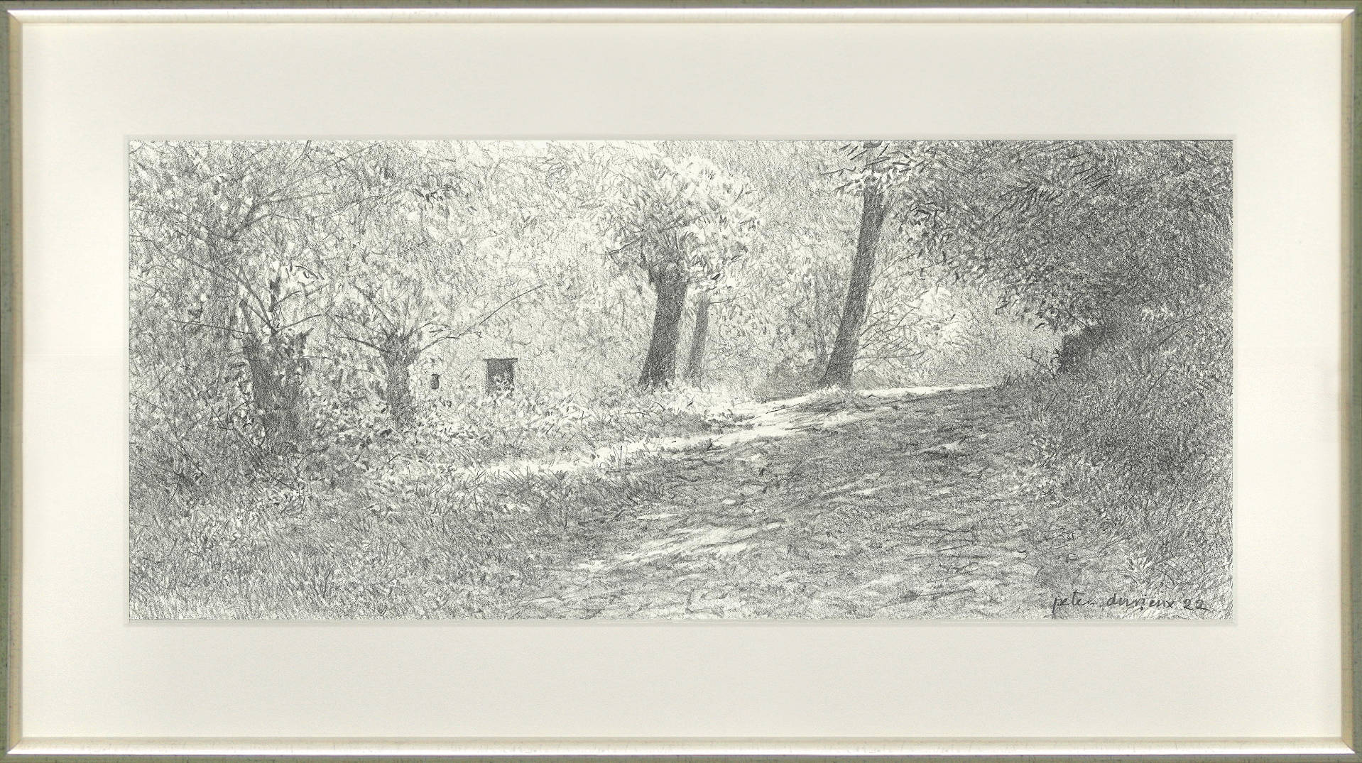 Het schilderij is 13 x 30 cm en voorzien van een zilveren houten lijst met passepartout en glas. De totale afmeting is 30 x 48 cm