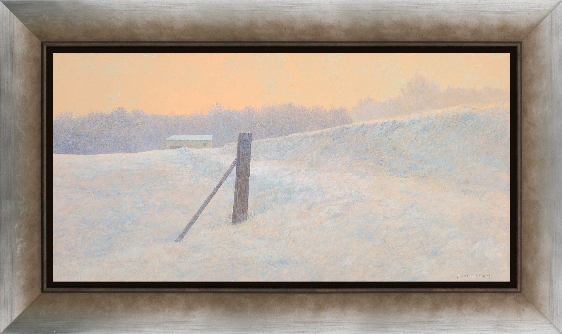 Het schilderij is 20 x 40 cm en voorzien van een champagne kleurige houten baklijst. De totale afmeting is 30 x 50 cm