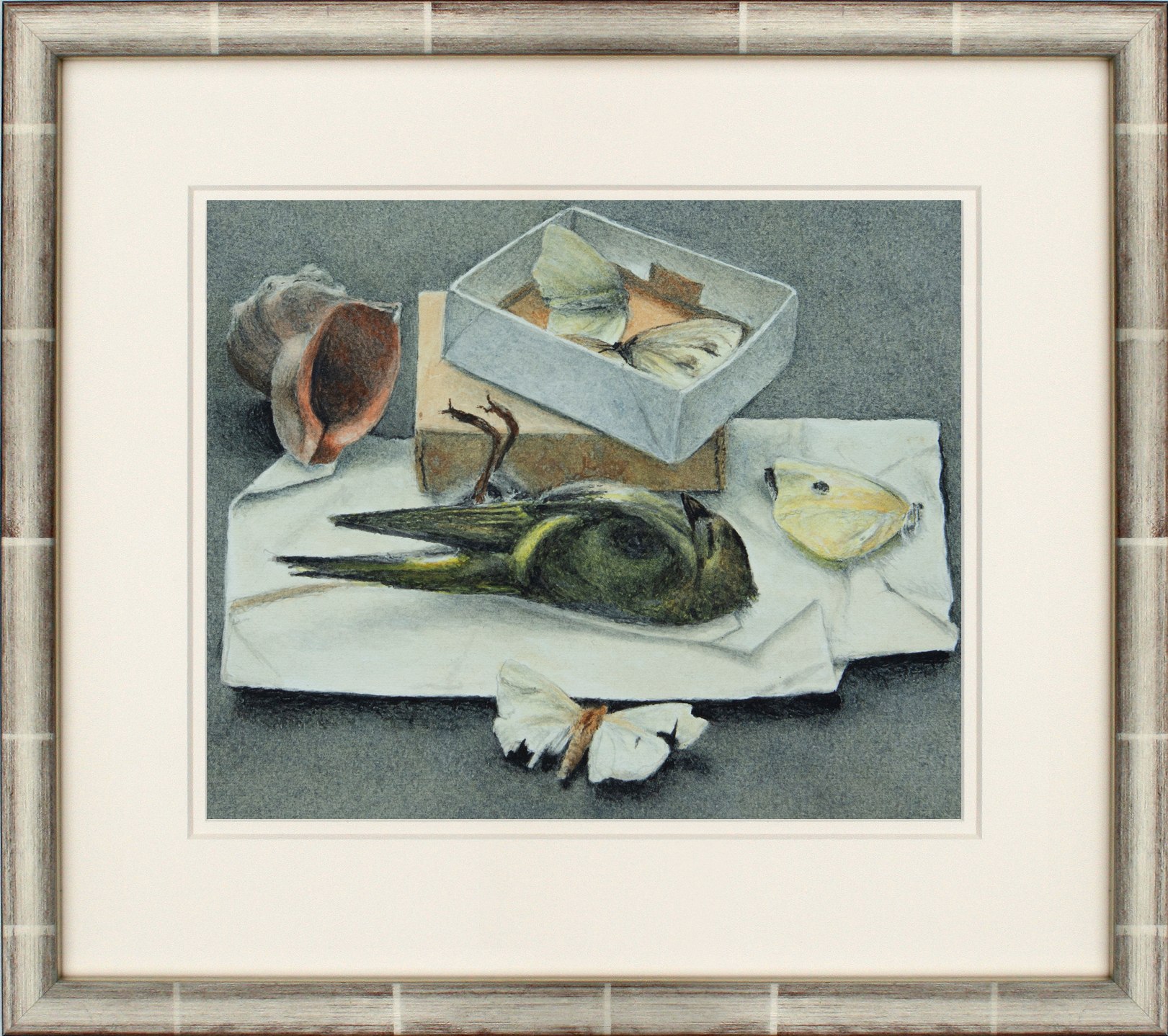 Het schilderij is 13 x 14 cm en voorzien van een zilveren lijst met een passepartout en museumglas. De totale afmeting is 31 x 32 cm