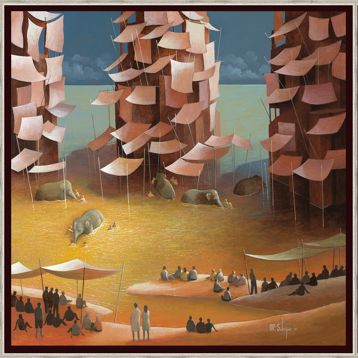 Het schilderij is 100 x 100 cm en voorzien van een houten baklijst handmatig gekleurd en opgelegd met echt zilver. De totale afmeting is 105 x 105 cm