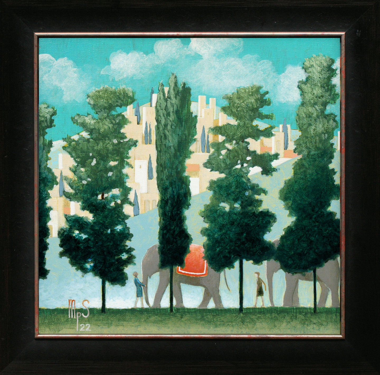 Het schilderij is 30 x 30 cm en voorzien van een zwarte lijst met zilveren binnenrand. De totale afmeting is 39 x 39 cm