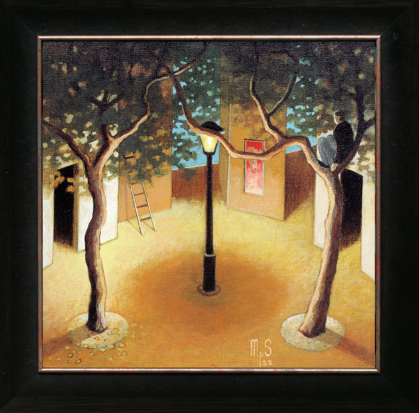 Het schilderij is 30 x 30 cm en voorzien van een zwarte lijst met zilveren binnenrand. De totale afmeting is 39 x 39 cm
