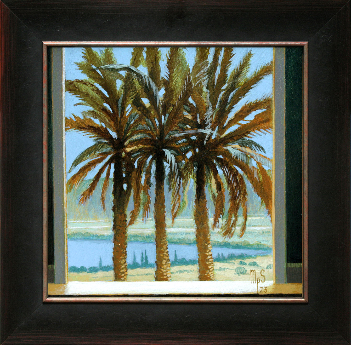 Het schilderij is 25 x 25 cm en voorzien van een zwarte lijst met zilveren binnenrand. De totale afmeting is 34 x 34 cm